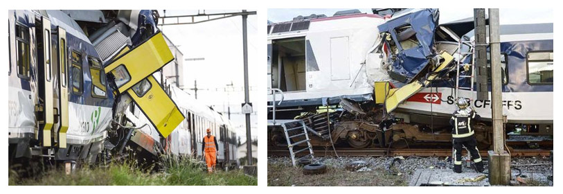 Ayer a las 19.00 horas se produjo un accidente en la estación suiza de Granges-près-Marnand (Cantón de Vaud), cuando una de los trenes llegó a la estación al mismo tiempo que otro salía de ésta en sentido contrario. Uno de los convoyes era un tren regional y el otro era un tren de cercanías. En el accidente resultó muerto el maquinista y treinta y cinco personas heridas, cinco de ellas de gravedad.