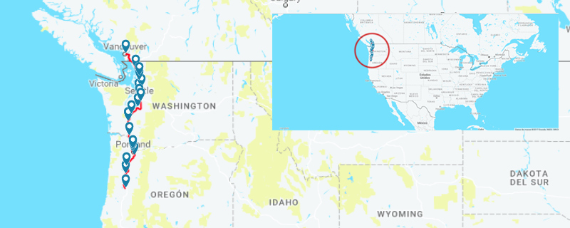 El servicio de trenes Cascades lo opera Amtrak por encargo de los Departamentos de Transporte de Washington y Oregón, en una línea que enlaza Vancouver en la Columbia Británica canadiense y Eugene en Oregon.