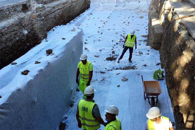 (06/05/2016) El consorcio que ejecuta el trazado entre Guadalmedina y Atarazanas del metro de Málaga, ha puesto en marcha el plan para proteger los restos hallados dentro del recinto de obra. que incluye la extensión de una malla geotextil para, a continuación, proceder al relleno de tierras de los vestigios hasta la cota de nivel de calle consiguiendo, de este modo, dar uniformidad al terreno con medidas adicionales de protección y sin afección a los muros perimetrales del Fuerte de San Lorenzo.