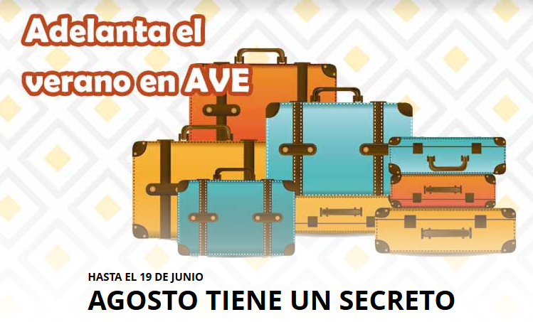 Renfe ha lanzado la campaña “Adelántate al verano” con miles de plazas en oferta en trenes AVE con precios fijos para viajar en el mes de agosto. Los billetes para viajar entre el 26 de julio y el 4 de septiembre, están a la venta hasta el 19 de junio o hasta agotar existencias.