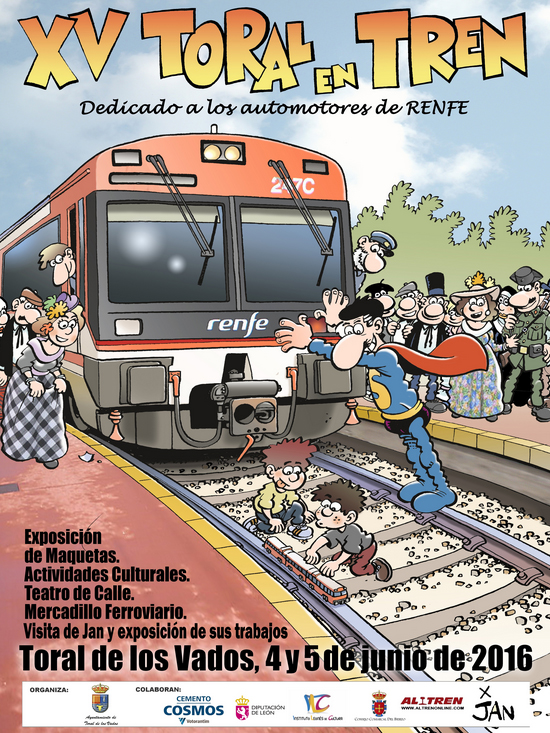 (03/06/2016) En esta edición, los automotores de Renfe serán los protagonistas de las celebraciones junto al dibujante Jan, “padre” de Superlópez y autor del cartel oficial, que expondrá gran parte de su obra en la localidad leonesa. Durante todo el fin de semana se podrá disfrutar de exposiciones de maquetas, de un mercadillo ferroviario, funciones de teatro en la calle y de las actividades que cada año llenan Toral de visitantes, curiosos y amantes del ferrocarril.