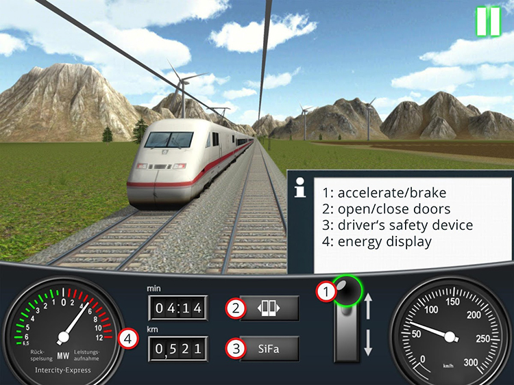 Los jugadores pueden seleccionar uno de los cuatro tipos de trenes que ofrece la aplicación: ICE, IC, RB, RE, y elegir entre tres rutas diferentes para iniciar el juego. Una vez iniciado el juego y alcanzado el primer destino, los jugadores pueden ver el total de energía ahorrada, gracias a lo eficiente de su conducción, y pasar al siguiente nivel.