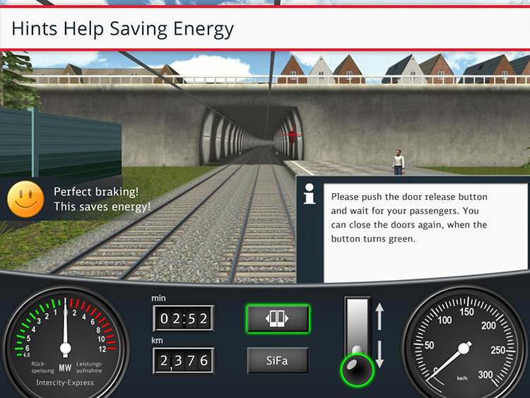 (10/06/2016) Durante años, la empresa alemana de ferrocarril, DB ha utilizado un programa especial para enseñar técnicas de bajo consumo energético en la conducción de trenes, ahora, ese programa se ha convertido en una aplicación en la que el reto de conducir reduciendo el consumo de energía en un viaje de ida y vuelta en ICE entre Hamburgo y Munich. Un jugador avezado, puede llegar a ahorrar hasta 4.000 kilovátios por hora, lo que equivaldría al gasto anual en electricidad de una familia de cuatro miembros.