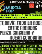 El Ayuntamiento y Tranvía de Murcia organizan un servicio especial de transporte para el Concierto de la Romería del lunes 12 de septiembre en el centro comercial Nueva Condomina entre las 21:30 y la 01:00 h.