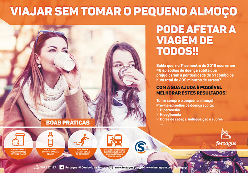 Fetargus, empresa concesionaria del servicio de cercanías entre Lisboa y Setúbal, se ha decidido a poner en marcha una campaña para concienciar a los viajeros de la necesidad de desayunar por el bien de todos los usuarios con mensajes como: “Viajar sin tomar el desayuno puede afectar al viaje de todos” tras analizar los datos que indican que en el año 2016 se han producido 46 episodios de indisposiciones repentinas y desmayos, lo que afectó a la puntualidad de un total de 51 trenes.