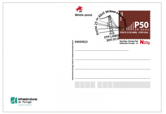 Infraestructuras de Portugal y Correos de Portugal han presentado la tarjeta prefranqueada conmemorativa del cincuenta aniversario del puente del 25 de Abril con la que pretenden destacar el papel unificador del puente que une las dos márgenes del río Tajo a su paso por Lisboa y que en 1974 cambio su nombre, puente de Salazar, por el de puente del 25 de abril.