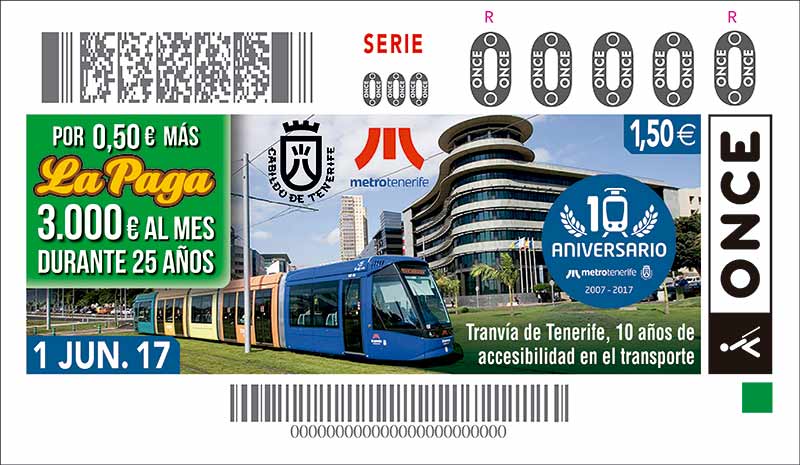 Con el eslogan “Tranvía de Tenerife, 10 años de accesibilidad en el transporte” se ha presentado el cupón que conmemora el aniversario del Tranvía de Tenerife. Cinco millones y medio de cupones difundirán esta efeméride en todo el territorio nacional pudiéndose adquirir a través de los más de 20.000 agentes vendedores de la Once. El sorteo se realizará un día antes del Aniversario del Tranvía, jueves 1 de junio.