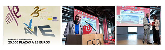 La campaña de venta de billetes promocionales a veinticinco euros que Renfe puso en marcha mensualmente durante el año pasado para celebrar el vigésimo quinto aniversario del AVE ha sido galardonada con el Premio de Internet en la categoría de Publicidad Online de Turismo y Viajes de la XXIII edición de los Premios de Internet, que tuvo lugar el 9 de mayo en Madrid como preámbulo al Día Mundial de Internet, que se celebra el 17 de este mes.