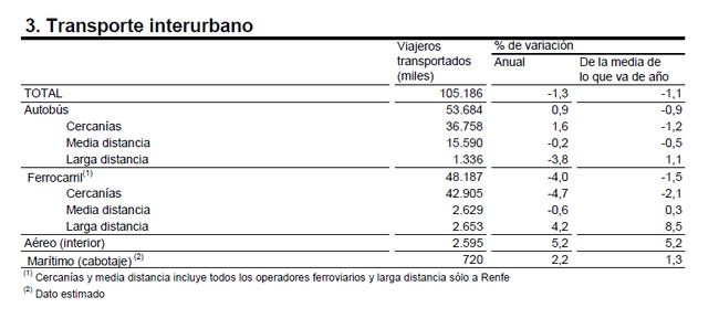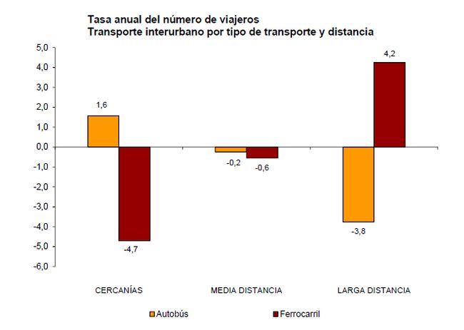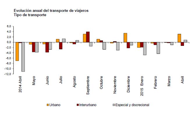 Los datos provisionales publicados por el Instituto Nacional de Estadística revelan que el número de viajeros del transporte público aumentó en abril un 1,6 por ciento con respecto al mismo mes del año anterior. El transporte urbano subió un 3,1 por ciento en tasa anual, mientras que el transporte interurbano descendió en un porcentaje del 1,3. El número de viajeros en ferrocarril, por su parte, descendió un 4 por ciento, si bien los trenes de larga distancia registraron un incremento del 4,2 por ciento.
