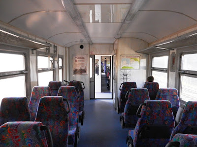 Generosa distribución de espacios en un tren regional de Letonia con un vestíbulo ampliado dentro del propio coche, en el que poner bultos o bicicletas, aparte de la plataforma entre coches