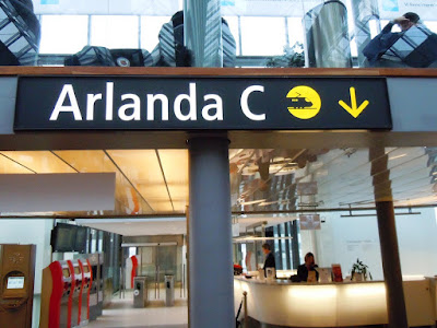 Acceso a la terminal ferroviaria bajo el vestíbulo del aeropuerto de Arlanda, en Estocolmo. Se trata de una estación pasante y todos los trenes que circulan al norte de la capital sueca tienen parada ahí, creando una intermodalidad perfecta entre tren y avión, que hemos utilizado allí algunas veces. El mostrador que se ve es la oficina de atención al viajero ferroviario y las máquinas de la izquierda son las de la venta de billetes de tren
