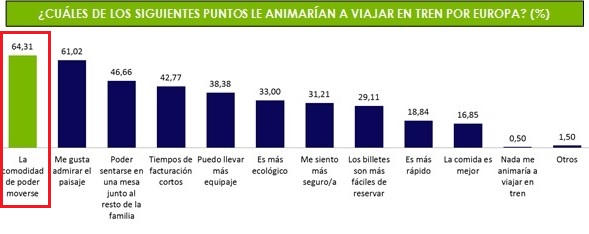 - Holandeses: Comodidad para poder moverse (37%); Ver el paisaje (35%); Ventaja del escaso tiempo necesario para acceder al tren (31%)