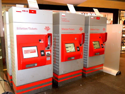 Máquinas de venta de billetes ferroviarios en la estación central de Oslo, probablemente las mejores que hemos visto en el ferrocarril. Son de manejo muy sencillo y venden todo tipo de billetes, desde los de Cercanías hasta los de Larga Distancia. También se pueden comprar en ellas sólo reservas de asiento, que no son obligatorias ni siquiera para las plazas sentadas de los trenes nocturnos