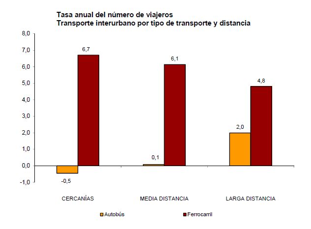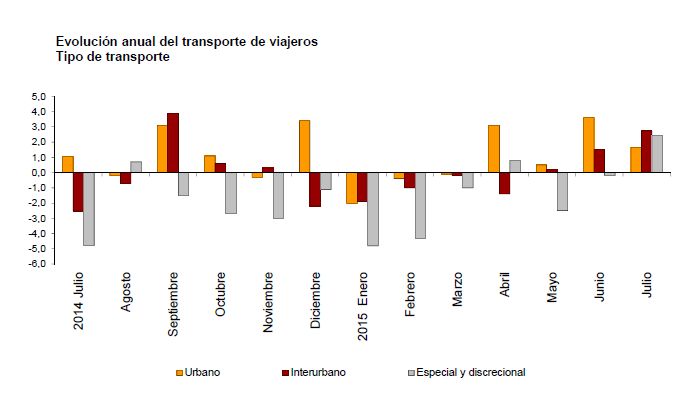 Los datos provisionales publicados por el Instituto Nacional de Estadística revelan que el número de viajeros del transporte público aumentó el pasado mes de julio un 2 por ciento con respecto al mismo mes del año anterior. El transporte urbano se incrementó un 1,6 por ciento en tasa anual, mientras que el interurbano lo hizo en un porcentaje del 2,7. Dentro de éste, el transporte por ferrocarril es el que más se incrementó, con una tasa del 6,6 por ciento.
