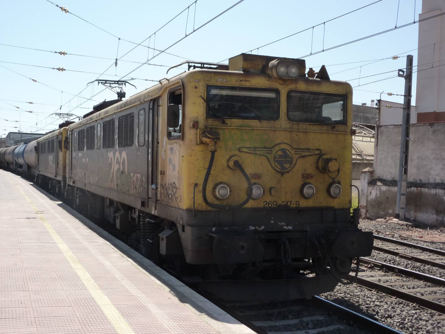 Doble de locomotoras eléctricas encabezada por la 269-517 en Alcázar de San Juan. Foto: Miguel Bustos.