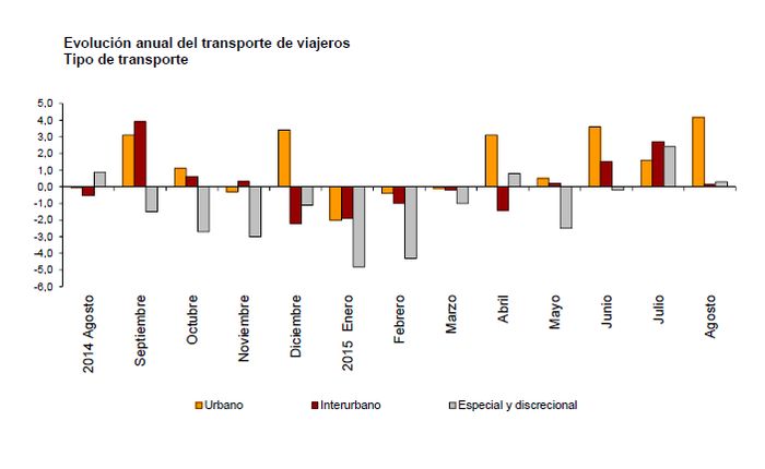 Los datos provisionales publicados por el Instituto Nacional de Estadística revelan que el número de viajeros del transporte público aumentó el pasado mes de agosto un 2,5 por ciento con respecto al mismo mes del año anterior. El transporte urbano se incrementó un 4,2 por ciento en tasa anual, mientras que el interurbano lo hizo en un porcentaje del 0,2. Dentro de éste, el transporte por ferrocarril se incrementó un 1,8 por ciento.