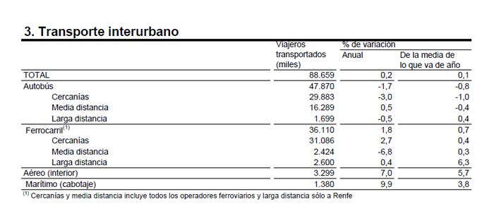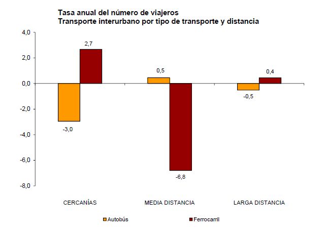 En cuanto al transporte por ferrocarril, registró un incremento global del 1,8 por ciento en dicho mes. Los viajeros de los trenes de larga distancia aumentaron en un porcentaje del 0,4 por ciento, los usuarios de trenes de cercanías lo hicieron en un 2,7 por ciento, mientras que las personas que utilizaron los servicios ferroviarios de media distancia descendieron en un porcentaje del 6,8.