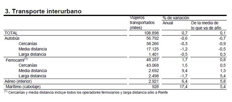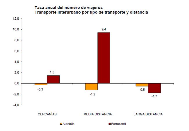 Los datos provisionales publicados por el Instituto Nacional de Estadística revelan que el número de viajeros del transporte público aumentó el pasado mes de septiembre un 1,4 por ciento con respecto al mismo mes del año anterior. Dentro del transporte por ferrocarril, que registró un incremento del 1,7 por ciento en dicho mes, destaca el aumento del de media distancia, con un 9,4 por ciento más de viajeros.