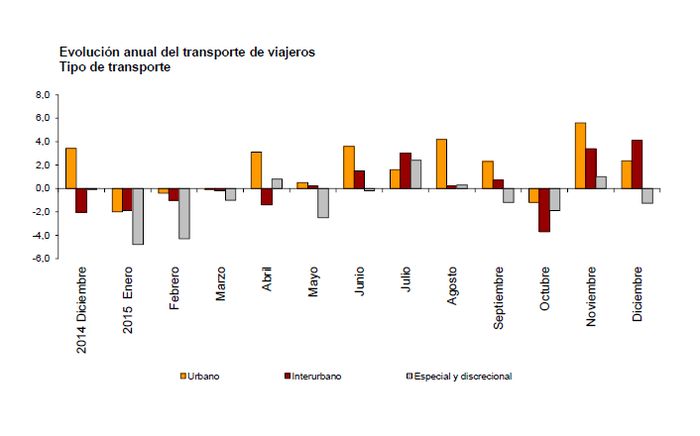 Los datos provisionales publicados por el Instituto Nacional de Estadística revelan que, en el conjunto del año 2015, el número de viajeros del transporte público aumentó un 0,9 por ciento respecto a 2014: tanto el transporte urbano como el interurbano registraron incrementos del 1,5 y el 0,4 por ciento, respectivamente. El transporte por ferrocarril, por su parte, registró un aumento del 0,5 por ciento en el número de viajeros durante el pasado ejercicio. En cuanto a los datos del mes de diciembre, el número de usuarios del transporte público aumentó un 2,5 por ciento respecto al mismo mes del año anterior.