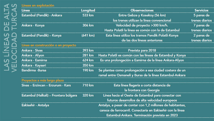 (17/03/2016) Teniendo en cuenta la superficie del país (783 562 km²) la red ferroviaria de Turquía no es muy extensa. Sólo cuenta con 8.772 kilómetros, la mayor parte de ellos en la Turquía asiática, y en su totalidad de ancho estándar. De ellos, 3.304 están electrificados a 25 kV 75 Hz y 436 son de vías de alta velocidad. Aunque la suma de las dos líneas abiertas para trenes de alta velocidad: Estambul-Ankara y Ankara-Konya suman más kilómetros, una parte de los trenes en la primera circulan por vía convencional, hasta que se terminen los tramos en obras. Además, ambas líneas tienen un tramo común entre Polatli y Ankara.