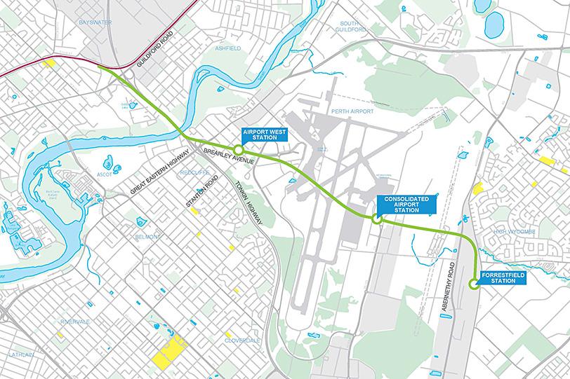 El trazado de la línea, de 8,5 kilómetros de longitud, comenzará en la línea Midland, al este de la estación de Bayswater, cruzará el río Swan, y contará con estaciones en los distritos de Belmont, Aeropuerto Central y Forrestfield. Al tratarse de una extensión de la red de cercanías de Perth, con un ancho de vía de 1.067 milímetros, en la que se va a utilizar el material rodante existente en dicha red, el proyecto se concibió para ser financiado íntegramente por el Estado, en lugar de ser ofrecido como un contrato de colaboración público-privada.