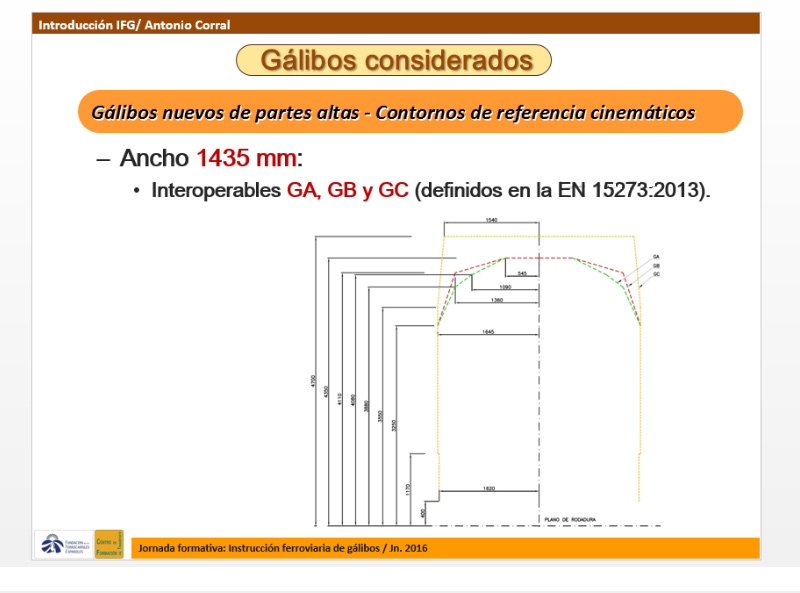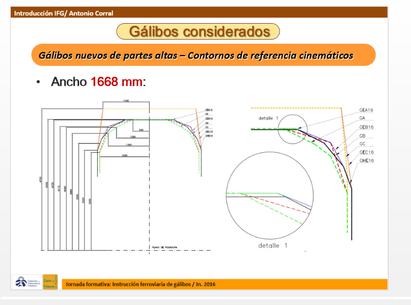 - Incorpora nuevos gálibos en ancho de vía 1668 mm envolventes del gálibo GHE16 y los interoperables GA, GB y GC, dando como resultado los gálibos GEA16, GEB16 y GEC16.