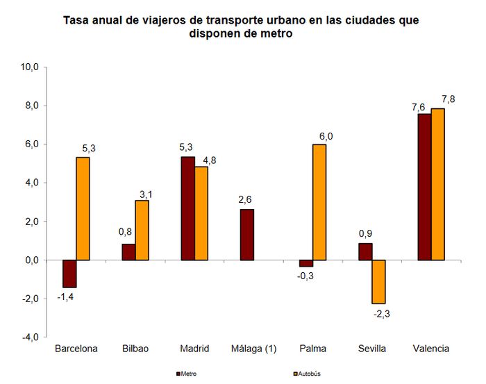 En cuanto al transporte metropolitano, éste aumentó en todas las ciudades, excepto en Barcelona, donde descendió un 1,4 por ciento, y en Palma (-0,3 por ciento). El metro de Valencia registró el mayor crecimiento, con un 7,6 por ciento más en tasa anual, seguido del metro de Madrid, con un 5,3 por ciento más de viajeros, Málaga (+ 2,6), Sevilla (+ 0,9) y Bilbao con un 0,8 por ciento más de demanda que en mayo de 2015.