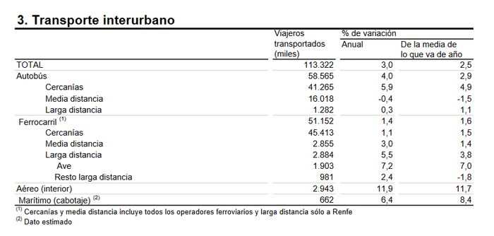 En lo que respecta al transporte por ferrocarril, registró un aumento del 1,4 por ciento. Los viajeros de los trenes de larga distancia aumentaron en un porcentaje del 5,5 por ciento, si bien concretamente los usuarios del AVE subieron un 7,2 por ciento.