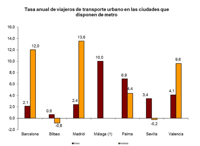 En cuanto al transporte metropolitano, registró un incremento global del 2,3 por ciento, con subidas en todas las ciudades en las que está implantado. El mayor aumento de viajeros se registró en el metro de Málaga, con un 10 por ciento más que en el mes de septiembre del año anterior, seguido de Palma, con un 6,9 por ciento más de usuarios, Valencia, con un 4,1 más, Sevilla (+3,4), Madrid, (+2,4), Barcelona (+2,1) y Bilbao, con un 0,6 por ciento más de viajeros que en septiembre de 2015.