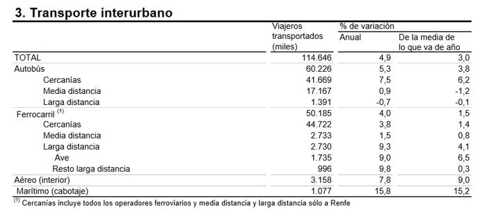 Los datos provisionales publicados por el Instituto Nacional de Estadística revelan que el número de viajeros del transporte público aumentó un 5 por ciento en septiembre respecto al mismo mes del año anterior. En lo que respecta al transporte por ferrocarril, registró un incremento del 4 por ciento en tasa anual, con subidas en tanto en Cercanías, como en Media Distancia, Larga Distancia y AVE.
