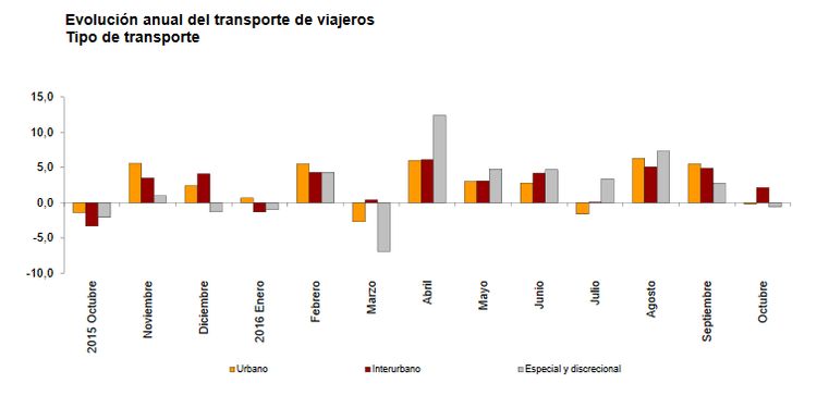 Más de 117,9 millones de viajeros utilizaron el transporte interurbano durante el pasado mes de octubre, lo que supone un incremento del 2,2 por ciento respecto al mismo mes de 2015, cifra que coincide con el aumento experimentado en dicho periodo por el transporte por ferrocarril.