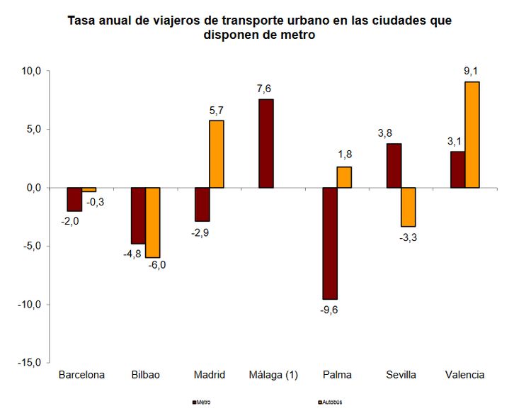 En cuanto al transporte metropolitano, registró un descenso global del 2,3 por ciento. De las siete ciudades que cuentan con este modo de transporte, el metro de Málaga es el que registró el mayor crecimiento, con 7,6 por ciento más de viajeros, seguido del de Sevilla, con un porcentaje positivo del 3,8 y el de Valencia, con un 3,1 por ciento más de usuarios.