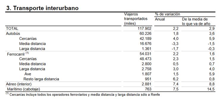 Los datos provisionales publicados por el Instituto Nacional de Estadística revelan que el número de viajeros del transporte público aumentó un 0,4 por ciento en el pasado mes de octubre respecto al mismo mes del año anterior. En lo que respecta al transporte por ferrocarril, el incremento registrado ascendió en octubre al 2,2 por ciento, con subidas tanto en Cercanías, como en Media Distancia, Larga Distancia y AVE.
