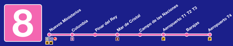 La línea 8 de Metro de Madrid tiene un recorrido de 16,5 kilómetros con ocho estaciones que conducen desde el centro de Madrid, en Nuevos Ministerios, hasta la Terminal 4 del Aeropuerto Adolfo Suárez Madrid-Barajas.