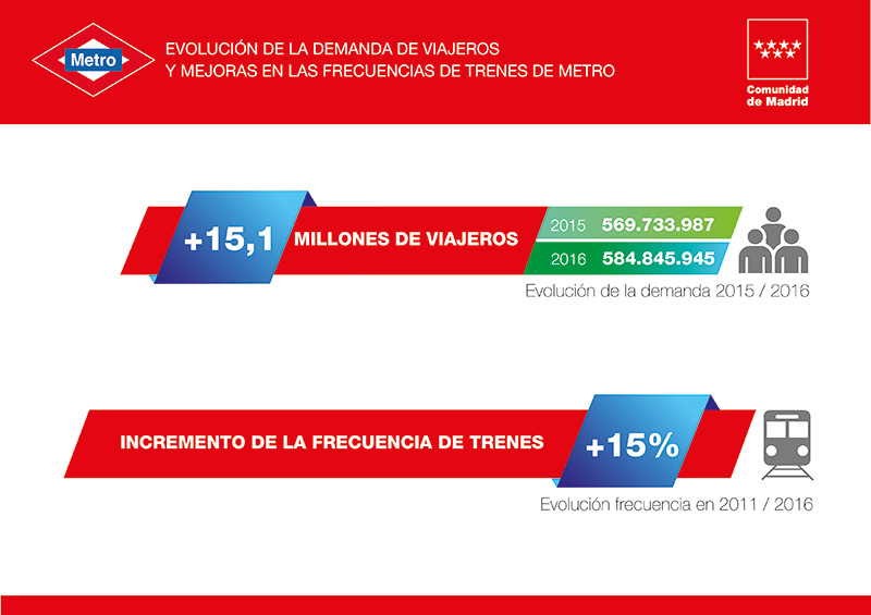 El uso de Metro se ha intensificado durante los días festivos de 2016, lo que confirma que un mayor usos para desplazamientos de ocio. Durante 2016 aumentó el uso de Metro un 4,79 por ciento durante los festivos, mientras que los laborables y sábados creció un 3,23 y un 3,43 por ciento, respectivamente.