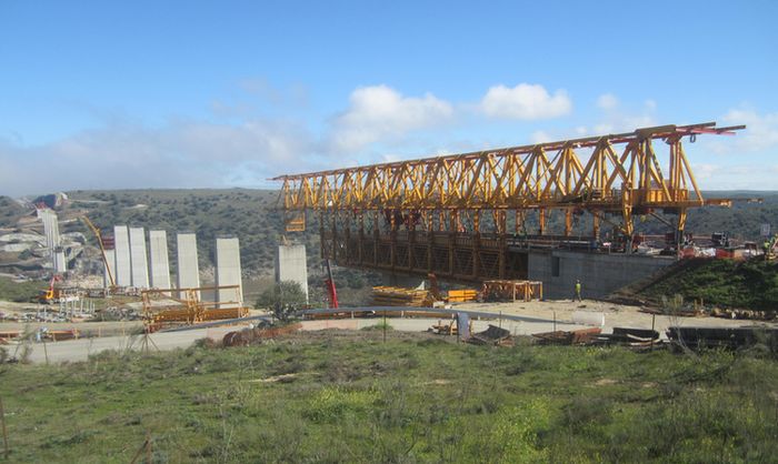 La construcción del tablero se ha realizado por medio de sendas cimbras autoportantes que se desplazan desde ambos estribos. Estas autocimbras consisten en una estructura metálica que apoya sobre las pilas y el tablero ya construido y del cual cuelgan los encofrados, y permiten la ejecución de vanos completos de hasta 45 metros de longitud.