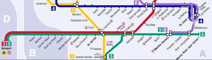 En la construcción de las nuevas estaciones de la conexión Puerto-Aeropuerto se produjo un cambio de filosofía, caracterizada por el diseño y la funcionalidad. Un buen ejemplo de ello es la estación de Marítim-Serrería, la única instalación subterránea de España que combina metro y tranvía, y que constituye un hito dentro de la trama urbana.