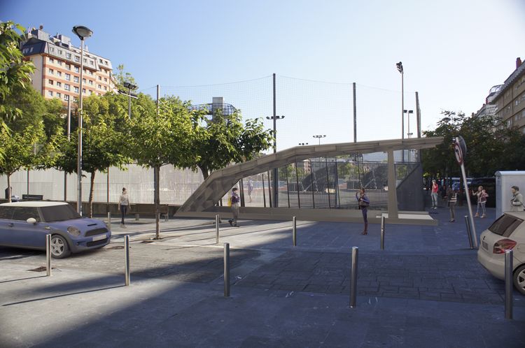 Infografías de los diferentes accesos de la futura estación de Bentaberri (accesos Norte, en la plaza de Bentaberri, Sur, en la confluencia de las calles Bertsolari Xalbador y Pedro Manuel Ugartemendia y ascensor frente al número 35 de la avenida de Zarautz, respectivamente.Tramo 2: Miraconcha-Easo