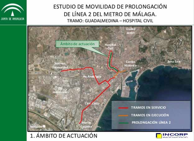 El Boletín Oficial de la Junta de Andalucía ha publicado la declaración de interés metropolitano del proyecto de prolongación de la línea 2 del metro de Málaga desde Guadalmedina hasta el Hospital Civil y Materno Infantil. Este tramo, que cuenta ya con el proyecto redactado, supondrá una inversión en obras de 41 millones de euros, y completará la red conforme a la solución consensuada entre la Junta de Andalucía y el Ayuntamiento de Málaga en 2013. La declaración actualiza la aprobada en 2002 para las líneas 1 y 2 inicialmente proyectadas y permite dar cobertura a la modificación de diseño que supuso este acuerdo.