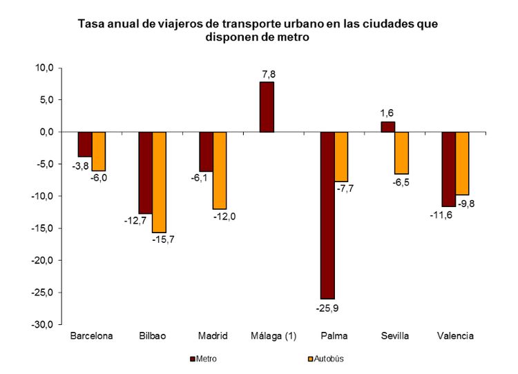 En cuanto al transporte metropolitano, registró un descenso global del número de usuarios del 5,9 por ciento, con tasas negativas en cinco de las siete ciudades que cuentan con este modo de transporte. El metro de Málaga fue el que experimentó un mayor crecimiento, con un 7,8 más de viajeros, y también lo hizo el de Sevilla, con un 1,6 por ciento más. Todos los demás disminuyeron en número de viajeros, siendo el de Palma el que se anótó una mayor bajada, con un 25,9 por ciento menos. Le siguieron los de Bilbao con una caida del 15,7 por ciento), el de Valencia conel 11,6, Madrid con un 6,1 y Barcelona, con una tasa negativa del 3,8 por ciento.