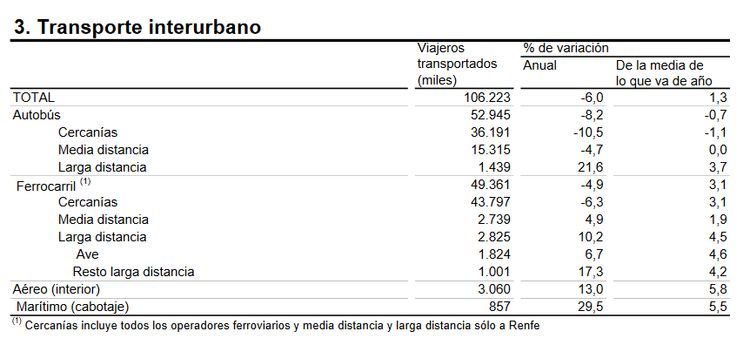 Dentro de éste, el transporte por ferrocarril registró un decremento del 4,9 por ciento en cifras globales en dicho mes. Los trenes de cercanías registraron una disminución del número de viajeros del 6,3 por ciento, mientras que los de media distancia y larga distancia experimentaron sendos aumentos del 4,9 y el 10,2 por ciento, respectivamente. Entre los usuarios de estos últimos, los del AVE aumentaron en un porcentaje del 6,7 y los del resto de trenes de larga distancia lo hicieron en un 17,3 por ciento.