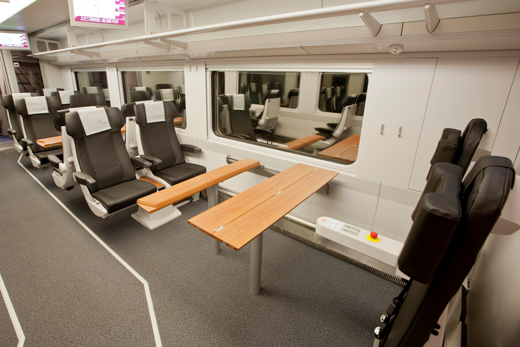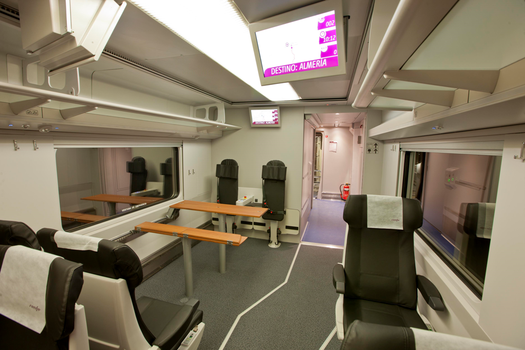 Renfe renovó el pasado mes de septiembre los trenes Talgo VI que enlazan Madrid y la capital almeriense con el objetivo de incrementar el confort a bordo. La remodelación ha mejorado de forma integral el interior de los vehículos, con la renovación de la tapicería, incorporación de plazas con mesas, nueva organización del espacio para el equipaje, enchufes en cada asiento y un nuevo coche cafetería, entre otras actuaciones.