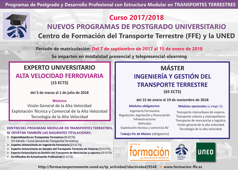 El Centro de Formación del Transporte Terrestre de la Fundación de los Ferrocarriles Españoles y la UNED han abierto el plazo de matrícula de sus programas de postgrado y desarrollo profesional, con estructura modular, en transporte terrestre.