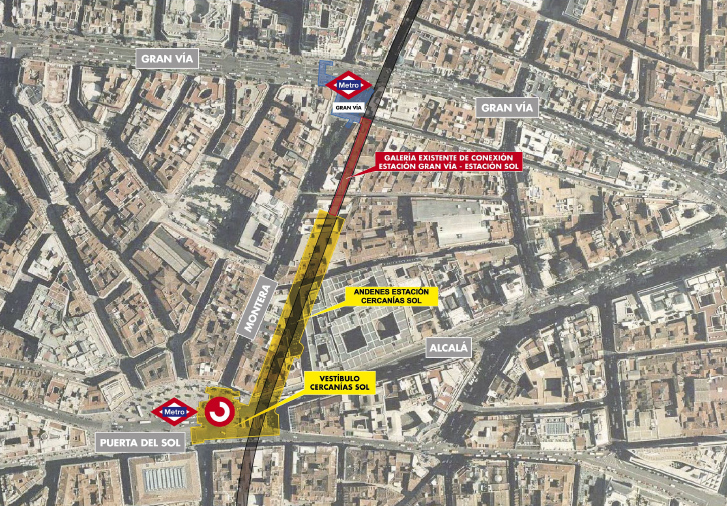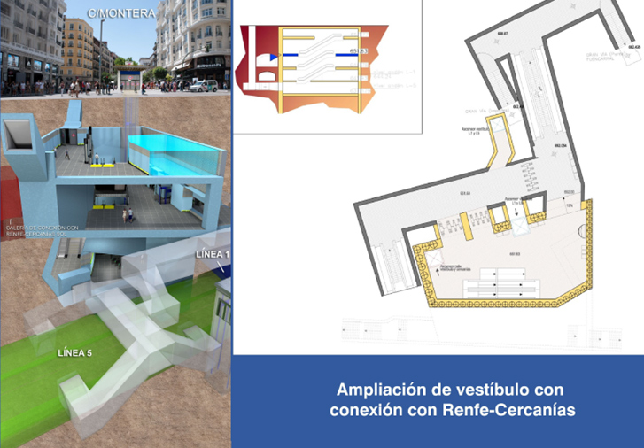 Las obras conectarán Gran Vía con la estación de Cercanías de Sol, uno de cuyos pasillos discurre bajo la calle Montera, creando un eje que descargará el volumen de viajeros de la estación de Sol y distribuyendo su flujo El nuevo túnel de conexión que tendrá una longitud de 85 metros y 5,5 metros de anchura, será utilizado a diario por más 23.000 usuarios.