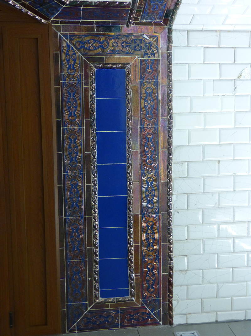 En cada esquina del vestíbulo hay un pilar decorado con azulejos sevillanos en azul brillante, rematados con bordes dorados y motivos florales en dorado y azul. Los pilares están unidos entre sí a través del techo mediante cenefas de azulejos, formando un conjunto abovedado rematado con la misma ornamentación.