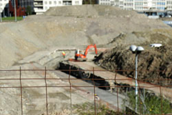 Actualmente, ya son visibles las primeras excavaciones necesarias para la anulación del aliviadero. En la parcela norte se han ejecutado los taludes necesarios para la construcción del muro verde y en la parcela oeste se trabaja en la ejecución de cimentaciones.