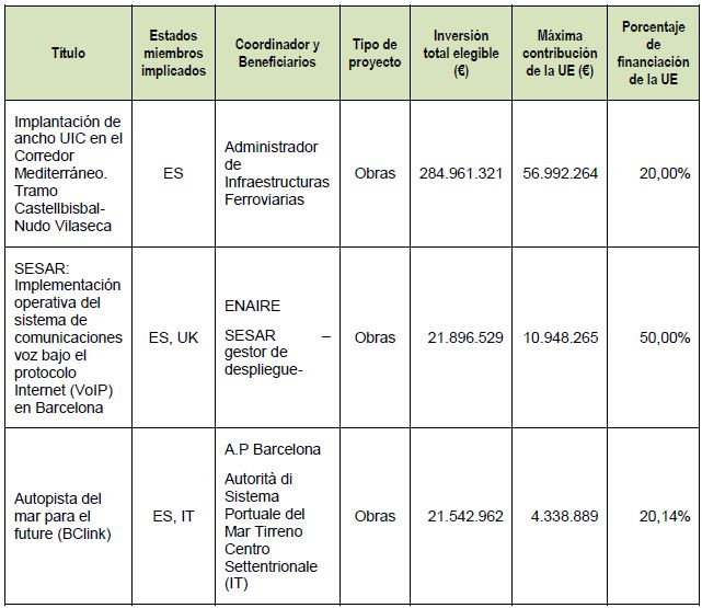 La propuesta española a la convocatoria incluía un total de siete proyectos, que suponían una inversión en España de unos 555 millones de euros, para los que se solicitaba una subvención del 31 por ciento. En las tres convocatorias anteriores del Connecting Europe Facility - CEF en el actual marco, la Comisión ha otorgado un total de 981 millones de euros para inversiones en España, de un total de 5.470 millones de euros aprobados para toda Europa.