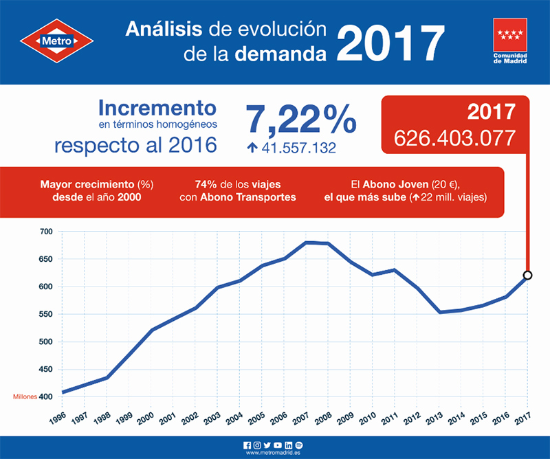 El 2017, Metro de Madrid transportó 626,4 millones, superando la barrera de los seiscientos millones por primera vez desde 2012 y confirmando un crecimiento sostenido en el número de viajeros durante cuatro años consecutivos.