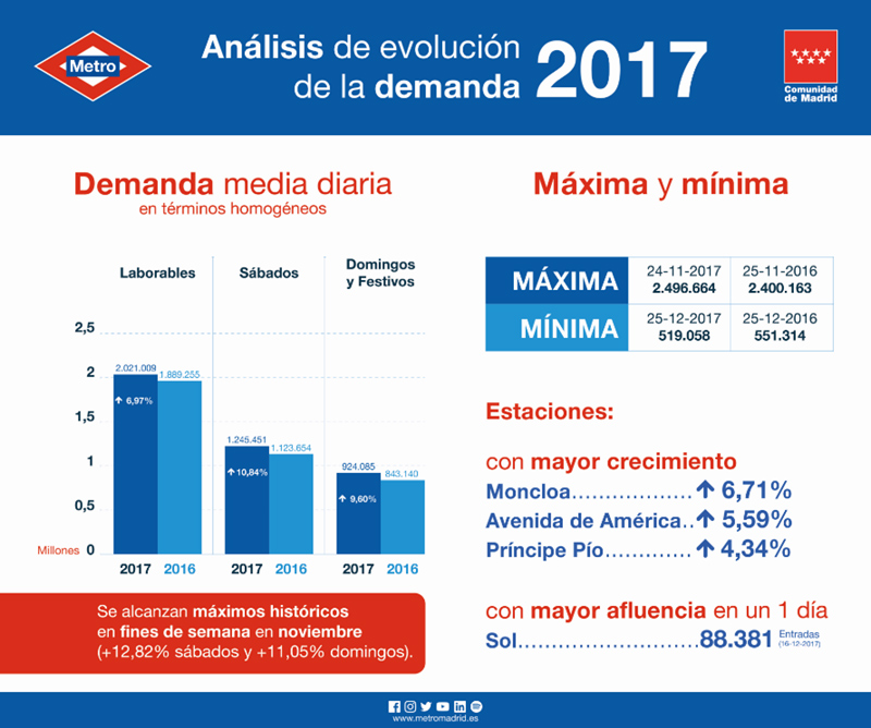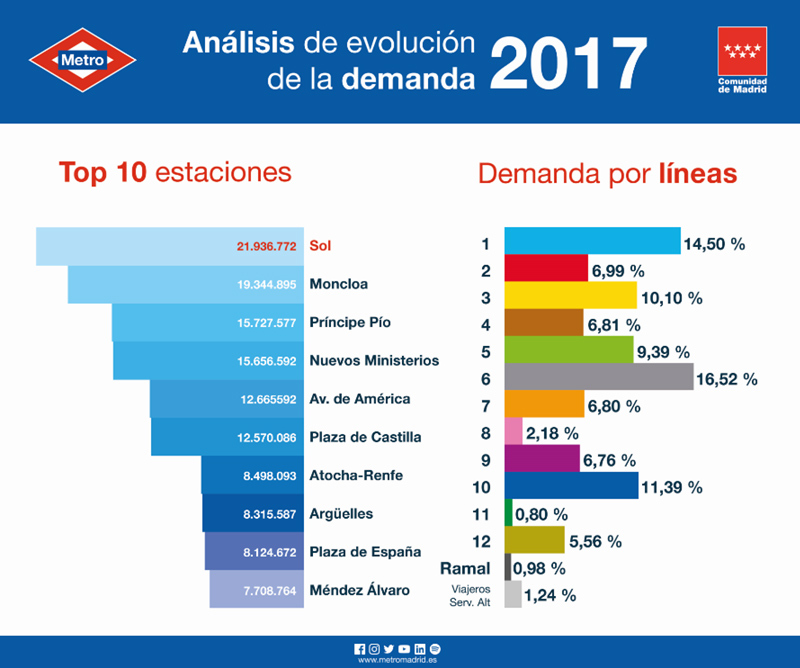 Las estaciones con más viajeros en 2017 fueron Sol, Moncloa, Príncipe Pío y Nuevos Ministerios. La mayor afluencia en un día se registró el pasado sábado 16 de diciembre con 88.381 en la estación de Sol que también registró la segunda marca con 86.205 entradas, el 7 de diciembre, por delante de Moncloa con 84.992 entradas el viernes 24 de noviembre.