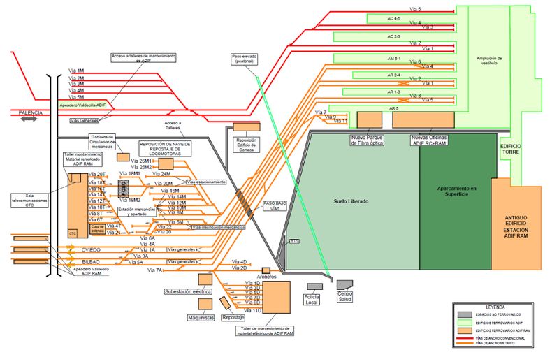 Para reorganizar los espacios ferroviarios se desplazará el haz de vías de ancho métrico hacia el Norte del complejo, de forma que este y el de ancho ibérico pasarán a estar contiguos. Para optimizar la configuración de la estación se modificará el haz de ancho métrico de forma que cuente con seis vías con parada en andén, de las cuales cuatro darán servicio a viajeros, mientras que las otras dos se reservan para posibles incidencias y para el tren Transcantábrico. Además, se añadirán tres vías de apoyo a los servicios de viajeros.